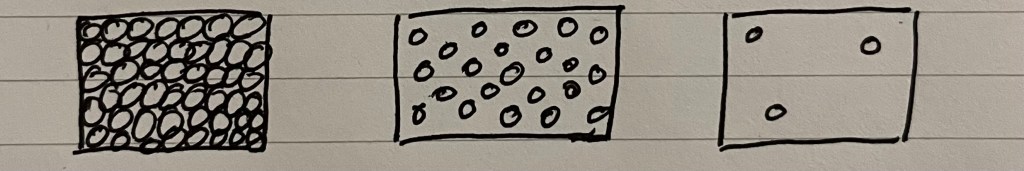 What can we discern? They they can imagine particles are really packed in with solids? That they get there’s a lot of empty space in a gas (and perhaps some believe that’s why there’s “not much” to the air around them)? And finally, that they have approximated that liquids must be about halfway between solids and gases, likely because liquid is the middle box. When we see this, we can be near certain that they have divorced their everyday experience of water in a bottle from this abstract representation.