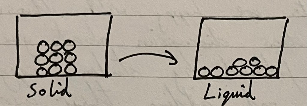 • (Notice in the diagram above: 8 particles in the liquid, when the solid had 9 to start with) I have missed something from the liquid diagram – can you see what it is?