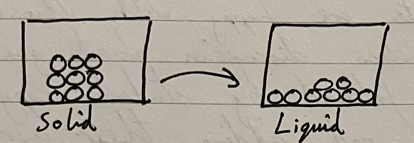 I would draw the following diagram whilst explaining that our solid has melted into a liquid, like ice melting into water.